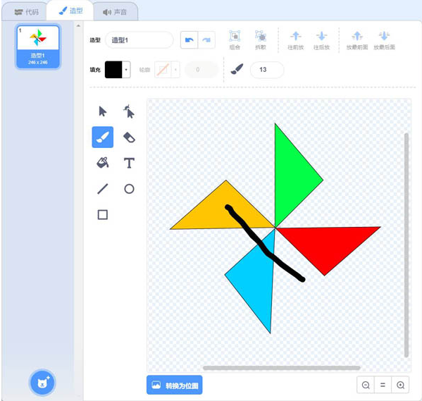 绘制完风车的图案后,不小心画错了,多画了一条黑色的...